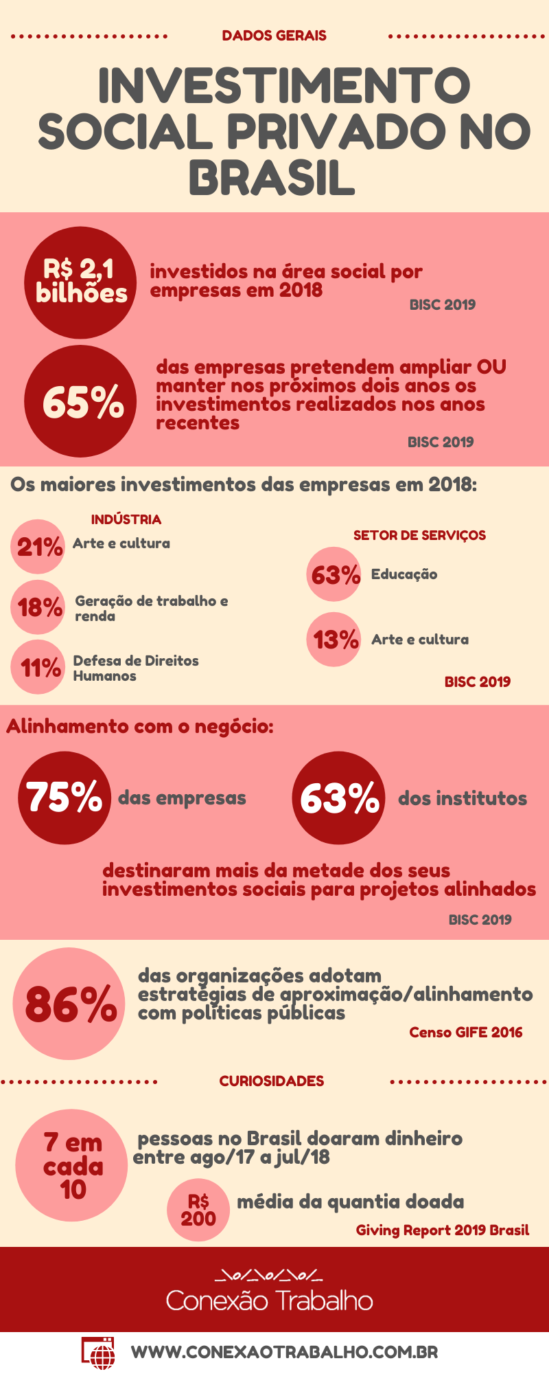 Agora a Conexão Trabalho fez uma seleção de dados relevantes sobre Investimento Social Privado no Brasil. Este infográfico faz um retrato sobre como e onde as maiores empresas brasileiras investem, de acordo com as pesquisas mais recentes. Traz também curiosidades sobre o perfil do doador no país. Confira!